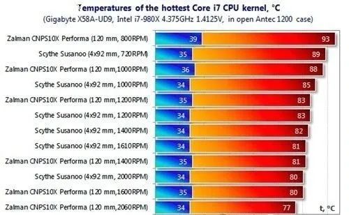 与西敏的五热管、一风扇和一塔风冷的CNPS-10X Performa相比,十二热管和四风扇的须佐之男仅在低速时具有优势。